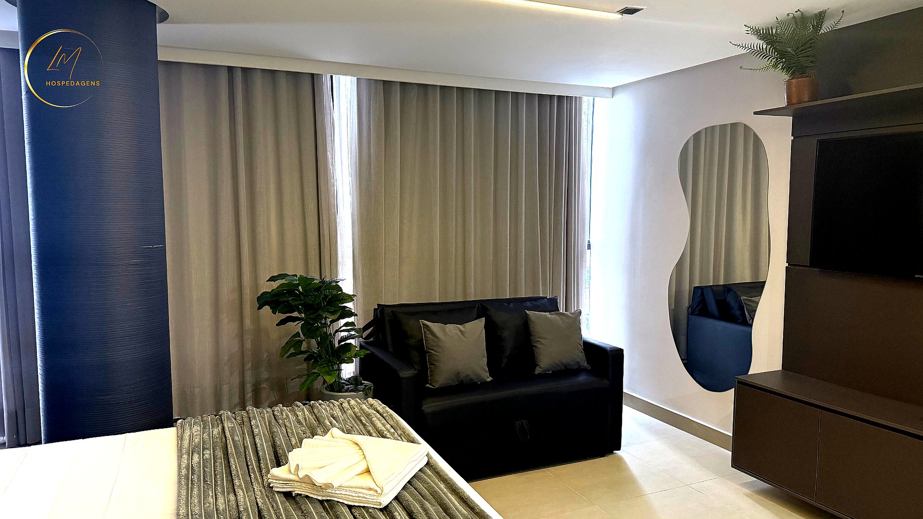 - Studio disponibilizando: Uma cama de casal e Um sofá cama de casal, lençóis premium, coberta, toalhas e travesseiros.